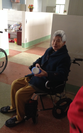 我們還與另外三個(gè)患老年癡呆癥的老人交談,其中有一個(gè),問(wèn)她多少歲時(shí),她說(shuō)想不起來(lái)了,好像是39歲。我們都笑了,但心中是酸澀的。有些老人還跟我們講他們小時(shí)候的經(jīng)歷,講著講著情不自禁的流出了眼淚,還有些老人喋碟不休的跟我們說(shuō)話,他們渴望與人溝通。